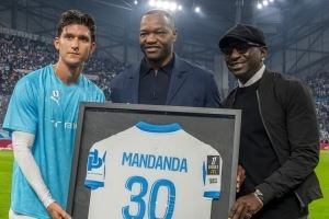 在马赛对阵勒阿弗尔的赛前,曼丹达从现任队长巴尔迪和前队友尼昂手中接过了一件纪念球衣,并为比赛开球。